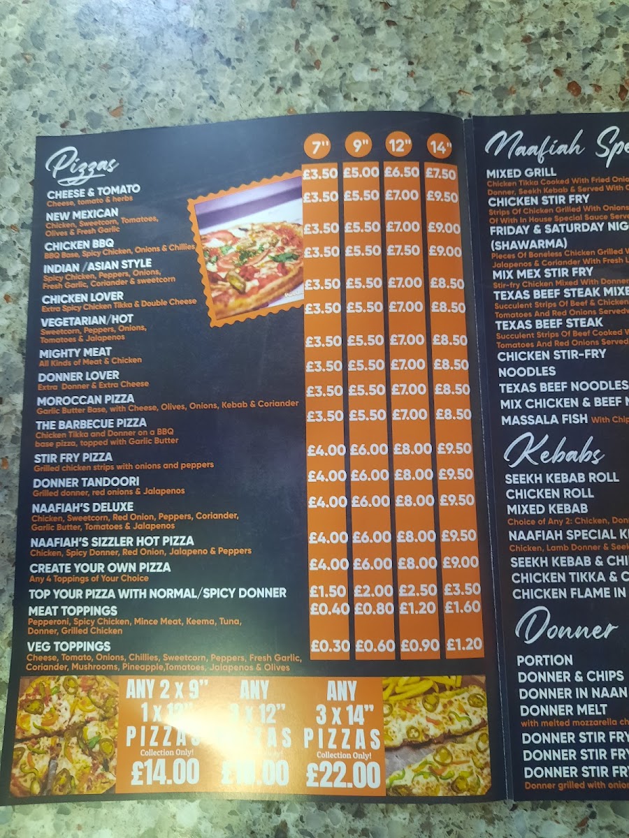 Welcome to Naafiah Preston, a culinary gem located at 17 Harewood Rd, Preston PR1 6XH, United Kingdom. This restaurant stands out for its delightful menu that features an impressive array of dishes, from mouthwatering pizzas to exquisite stir-fries. Each meal is a labor of love, showcasing a perfect blend of creativity and expertise. Customers rave about the quality and flavor of the food, with standout dishes like the donner sizzler earning particular praise.